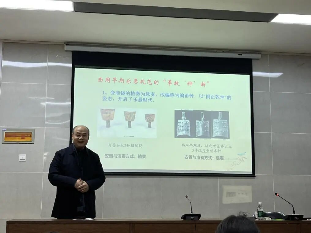 在第一部分,修教授以“革故‘钟’新——西周早期乐悬规范创改举要”为题,详细分析了西周早期乐悬制度的创改,列举了晋侯苏、曾侯乙以及海昏侯等编钟上的音阶实践。他指出,西周将殷商时期的“编铙”从“植奏”改为“悬奏”,并发展为“编甬钟”,标志着中国乐悬时代的开启。此外,西周钟器设计中“一钟二音三度音程”的规范,奠定了“双音钟”的工艺与音列基础;两周编钟的基组结构,作为编钟“编列—音列”设计的基本原则,贯穿于西周初至西汉双音钟的设计中。