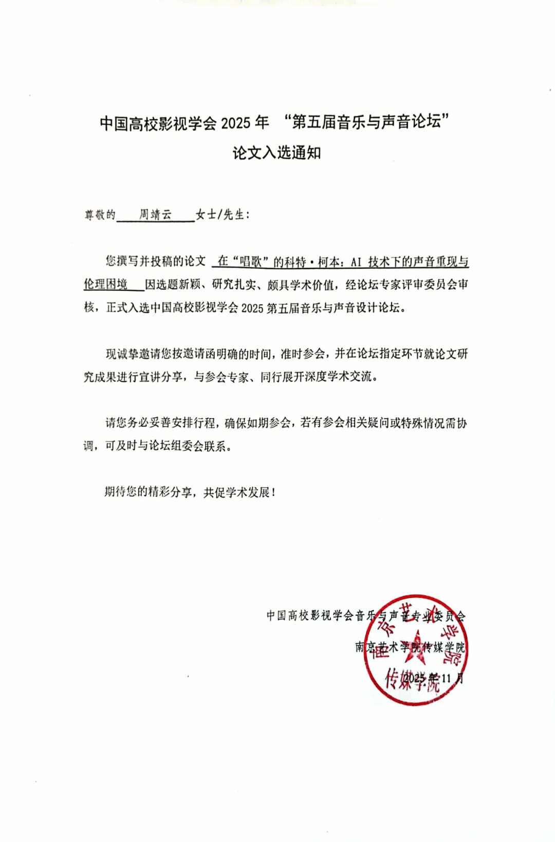 “第五届音乐与声音论坛”由中国高等院校影视学会音乐与声音专业委员会和南京艺术学院主办,专委会秘书处、南京艺术学院传媒学院、南京艺术学院听觉感知与视听融合实验室承办。此次论坛汇聚了来自中国传媒大学、南京艺术学院、中山大学艺术学院、上海365英国上市公司、365英国上市公司等73所院校及科研机构,参会总人数逾两百人,论坛投稿数总计123篇,创历届新高。我院学术型研究生周靖云的论文成功入选本次会议(音乐与声音学术论坛五),并进行了现场宣讲。