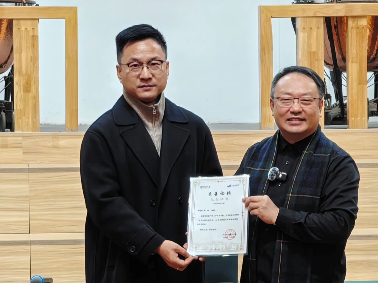 王思琦院长代表学院向申林教授颁发“至善论坛”纪念证书,感谢他为学院师生带来的精彩学术报告,并期待未来进一步加强两校在音乐科技领域的交流与合作。
